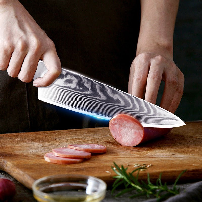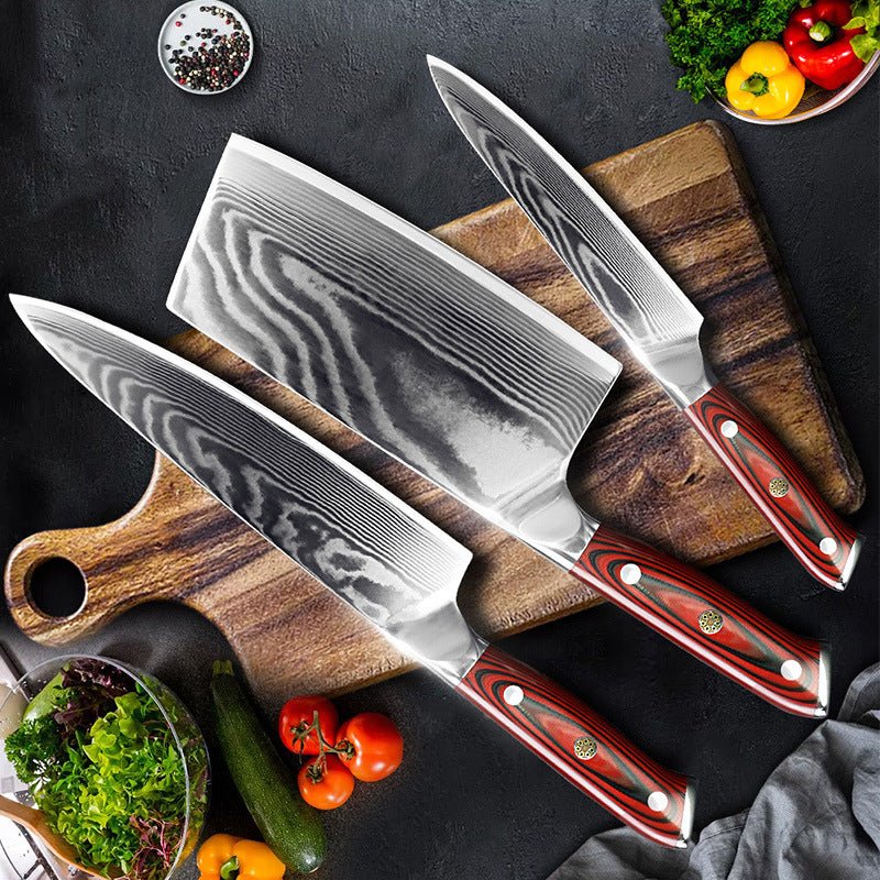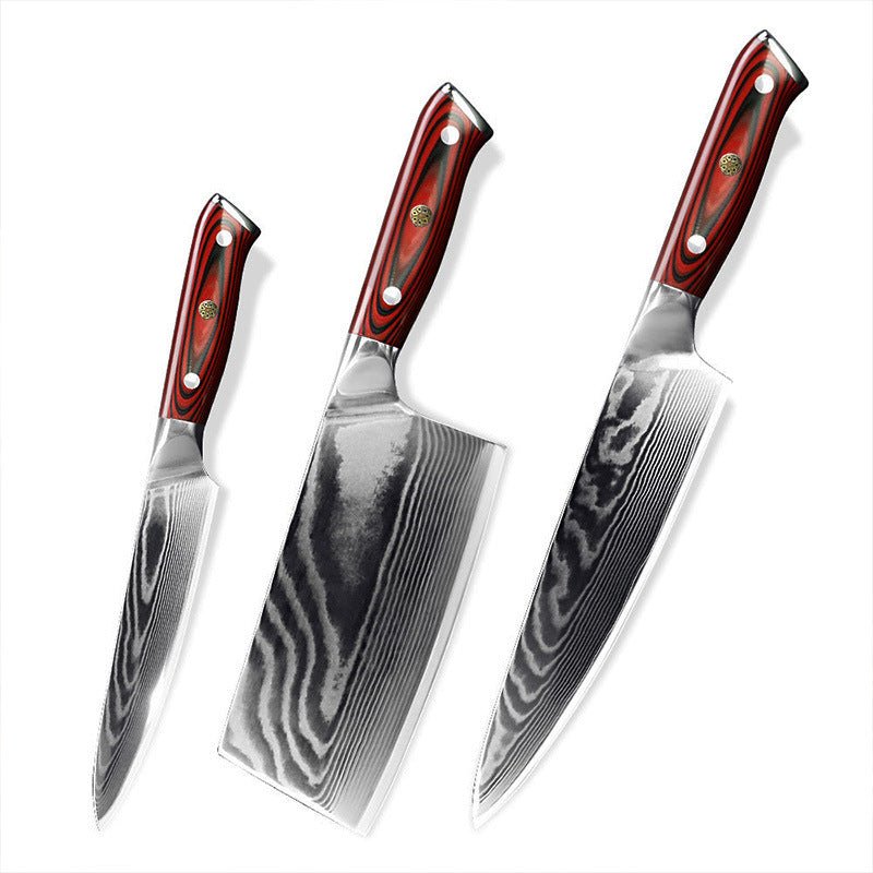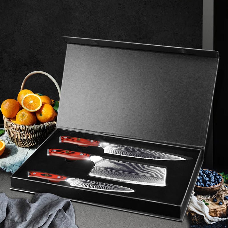 - De 3-delige koksmessenset is vervaardigd uit VG10 Damascusstaal, wat zorgt voor een hoge scherpte (60±2 HRC) en een lange levensduur.
