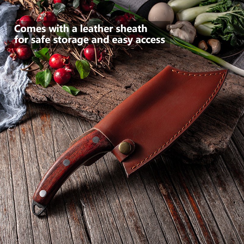 Ervaar de kunst van handgemaakt vakmanschap. Ons handgesmede hakmes is het toonbeeld van traditie en uitmuntendheid. Het is zorgvuldig gehamerd en met de hand gepolijst en heeft een glad en vlijmscherp lemmet met een unieke textuur, waardoor het zich onderscheidt van gewone slagersmessen. Met zijn opmerkelijke slagvastheid, slijtvastheid en corrosiebestendigheid steekt dit hakmes met kop en schouders boven de rest uit.