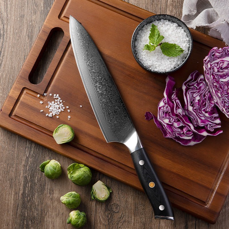 - Dit 8" handgemaakte Damascus-koksmes is gemaakt van hoogwaardig 67-laags Damascus-staal, met een snijkern van 60+2 Rockwell-hardheid, een snijrand van 16-18 graden, een superscherpe snede, buitengewone prestaties en een perfecte korrel.