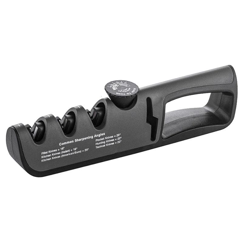 Multifunctioneel en gebruiksvriendelijk - Bereid maaltijden als een professional! Deze hybride slijper is perfect voor alle soorten keukenmessen met een rechte snede: uitbeenmessen, koksmessen, vleesmessen, hakmessen, Santoku-messen, fileermessen, schilmesjes - en ja, hij heeft ook een schaargleuf om alle soorten scharen te slijpen! Of u nu rechts- of linkshandig bent, dankzij het ergonomische handvat en de antislip rubberen onderkant kunt u uw keukenmessen in een paar seconden weer scherp maken! Plaats het mes gewoon in een van de sleuven en haal het mes een paar keer voorzichtig door de slijper voor snel en effectief slijpen. De handige knoppen voor het instellen van de hoek zijn allemaal