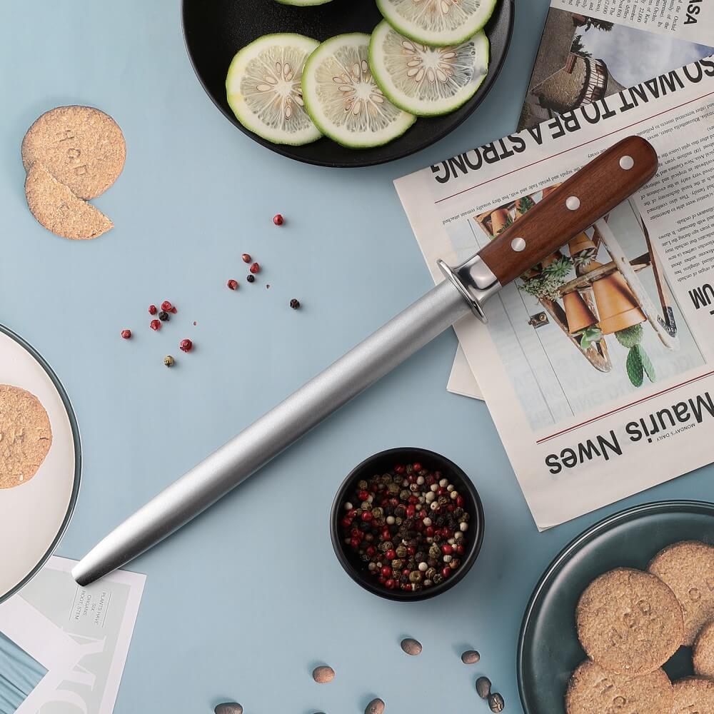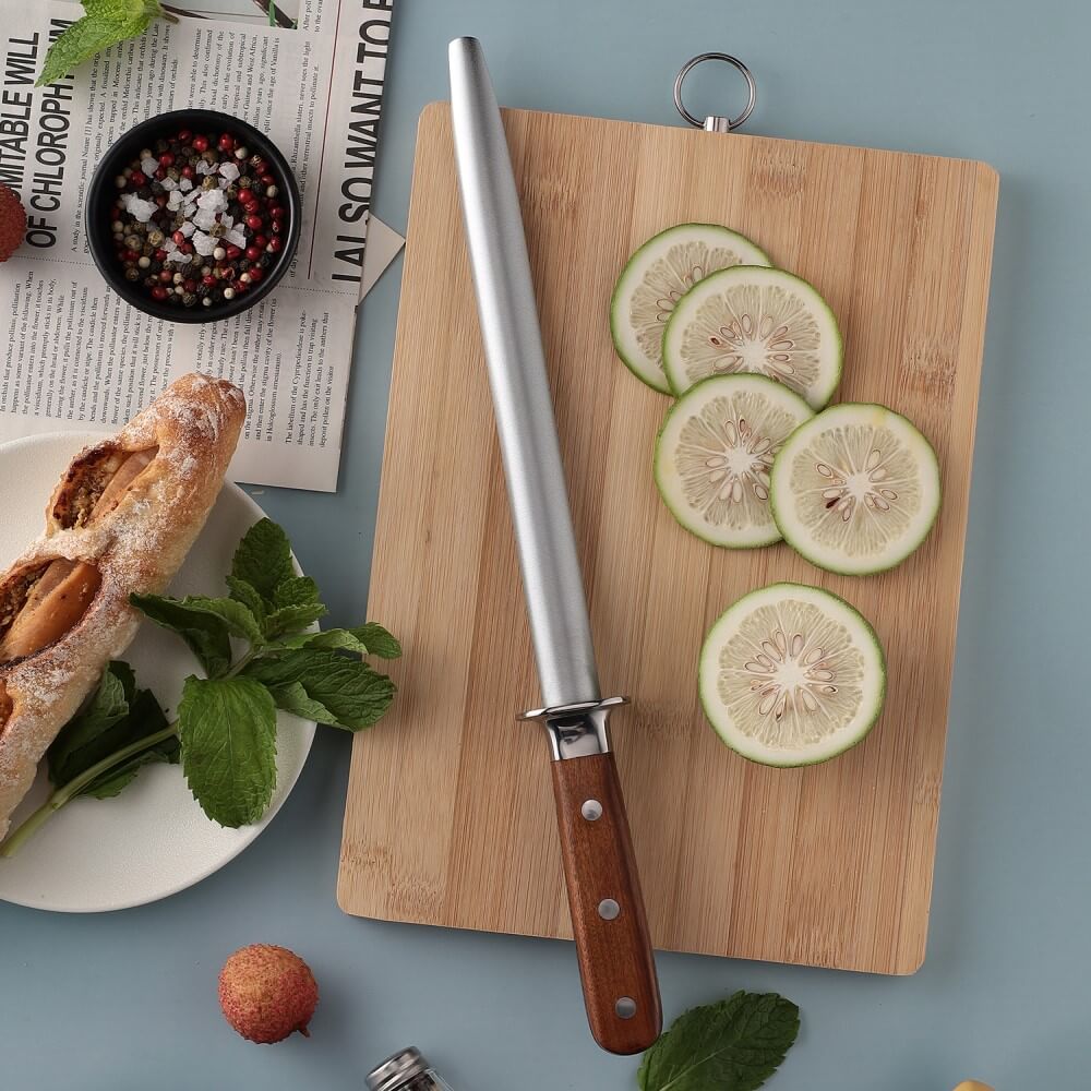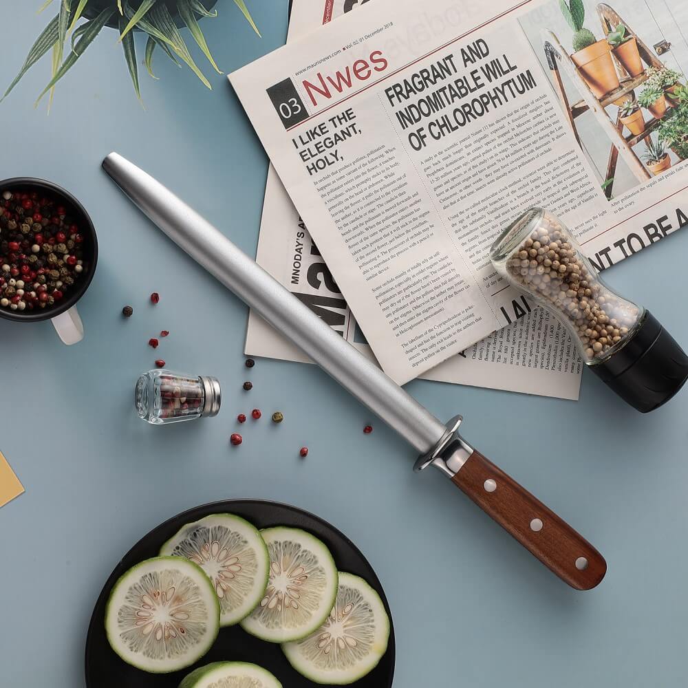 Het belangrijkste doel van dit product is om uw messen effectief te slijpen en de vlijmscherpe snede van punt tot hiel te behouden. Het enige wat u hoeft te doen is het mes in de gewenste hoek op en neer over de staaf te schuiven. Hierdoor ontstaat er wrijving die de snede van het mes recht trekt. Tegelijkertijd verwijdert u hiermee ook deeltjes die ervoor kunnen zorgen dat het mes gaat roesten en bot wordt. Daarnaast kunt u deze staaf ook gebruiken om ander snijgereedschap, zoals keukenschaar of scharen, te slijpen. Deze slijpstaaf is duurzaam en onmisbaar in de keuken.