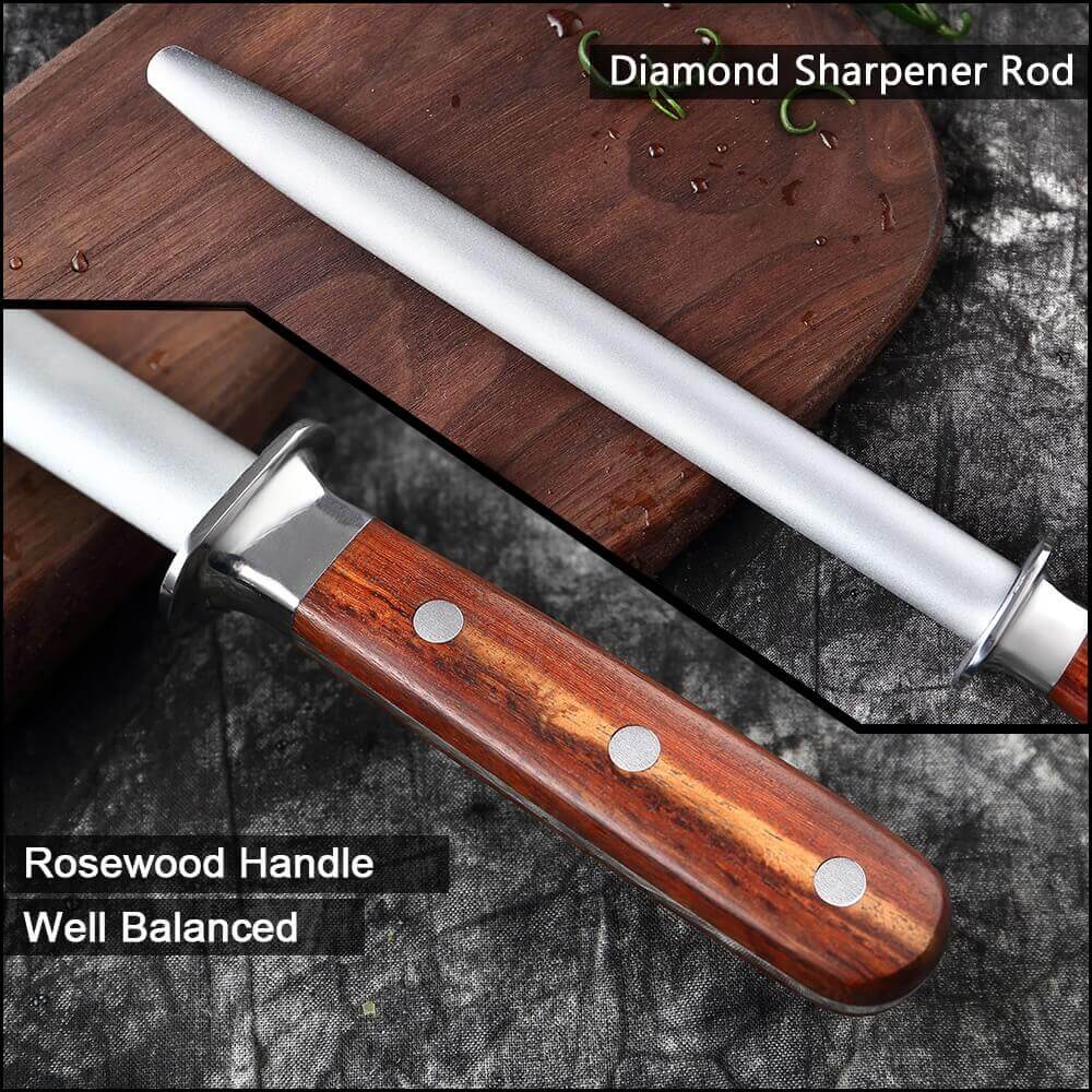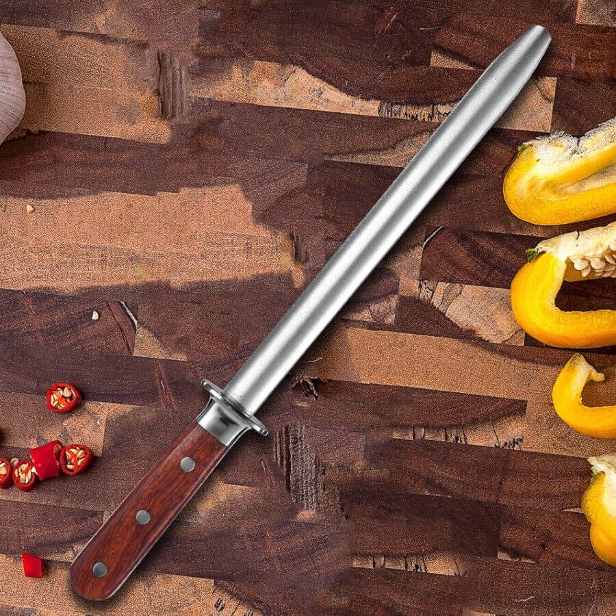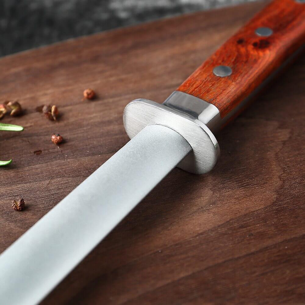 Ook bekend als slijpstaal — onmisbaar om uw mes scherp te houden. Dit lange mes van puur slijpstaal heeft diamantdeeltjes voor snel en eenvoudig slijpen.