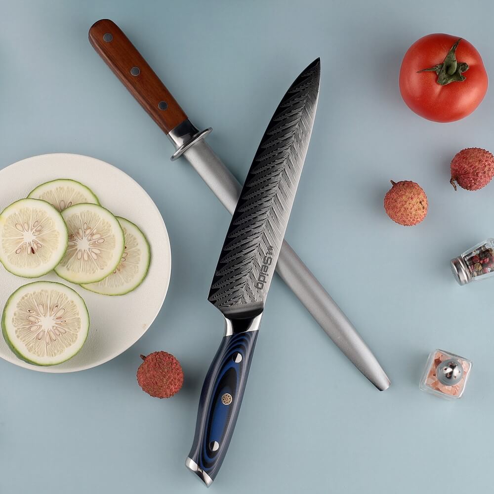 Sommige mensen denken dat scherpe messen gevaarlijk zijn. Maar de waarheid is dat botte messen nog gevaarlijker zijn dan scherpe messen. Wanneer u botte messen gebruikt om vlees of taaie groenten te snijden, moet u herhaaldelijk heel hard snijden en druk uitoefenen. Daardoor verbruikt u meer energie en oefent u onnodig veel kracht uit, wat ongemak en pijn in de pols veroorzaakt. Bovendien hebben botte messen de neiging om te glijden en tegen het voedsel te drukken in plaats van er soepel doorheen te snijden. Dit kan tot ongelukken leiden. Daarom is het cruciaal om uw messen regelmatig te slijpen.