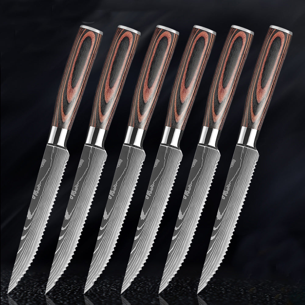 Maak indruk op uw vrienden tijdens een feestje: het imitatie Damascus-patroon met het gekleurde houten mesheft, vervaardigd met uitmuntend vakmanschap en geavanceerde technologie, maakt dit gekartelde roestvrijstalen steakmes zo mooi en bijzonder.